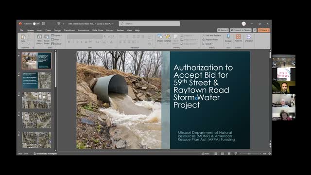 The Board awarded VF Anderson Builders a roughly $5.41M bid (approved at a $6.0M authorization with contingency) to replace about 1.3 miles of storm pipe and perform road work on 50 Ninth and Raytown Road; MDNR grant ($4.3M) plus $1.7M ARPA match fund the project.