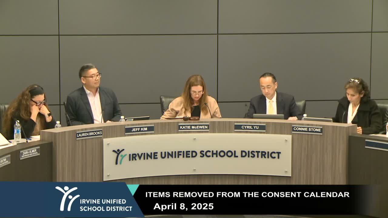 The Irvine Unified School District Board authorized the assistant superintendent of business services to enter into a contract with Renu Clark Architects to design a new Performing Arts Center at University High School, a Measure E Series 4 project.