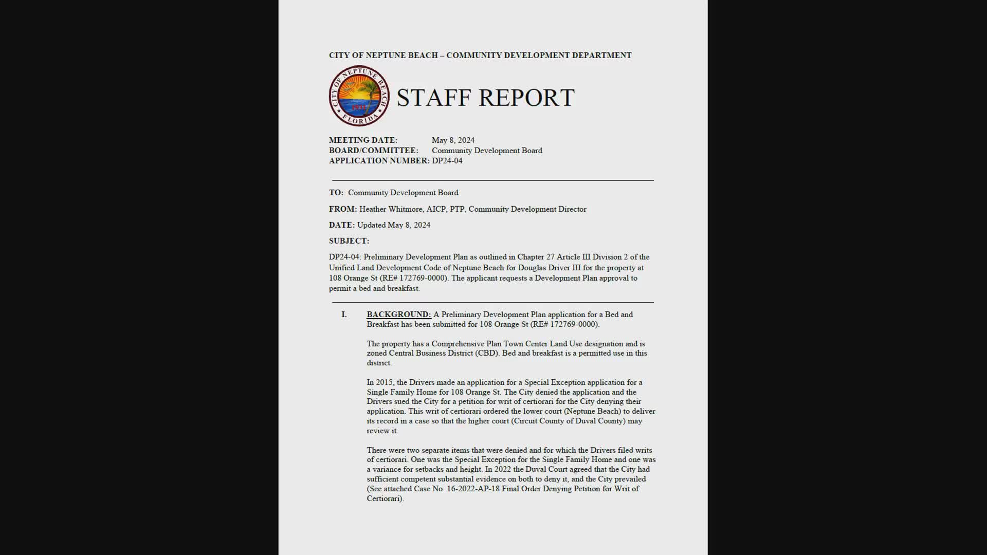 Provenance: Staff presentation and the start of the DP2404 hearing (Heather Whitmore) began in the staff report for DP2404 (SEG 1420). The final roll call and denial occurred after council discussion and the vote (SEG 3950–SEG 3973).