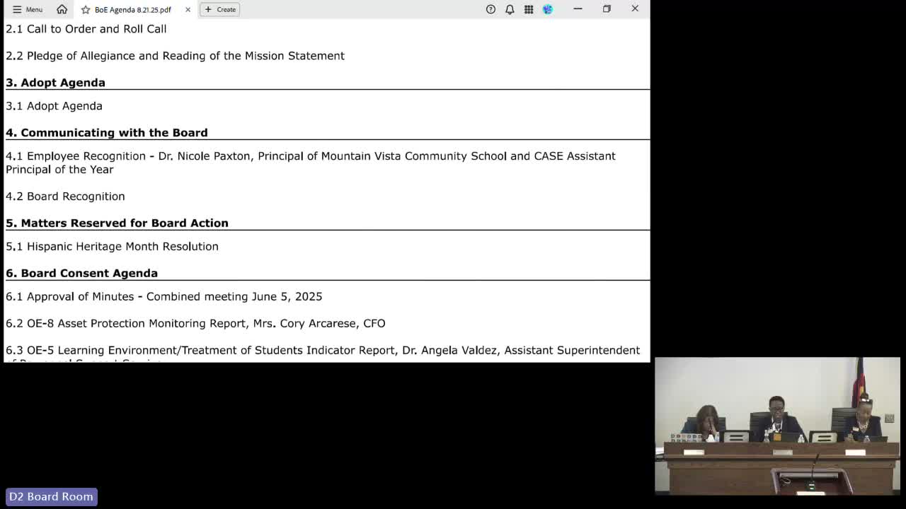 The Harrison School District No. 2 Board of Education met Aug. 21, 2024, and read a resolution proclaiming Sept. 15–Oct. 15, 2025 as National Hispanic Heritage Month for the district, noting that Hispanic and Latinx students are the district’s largest racial/ethnic group. Mr. Corey Williams read the resolution on behalf of the board.