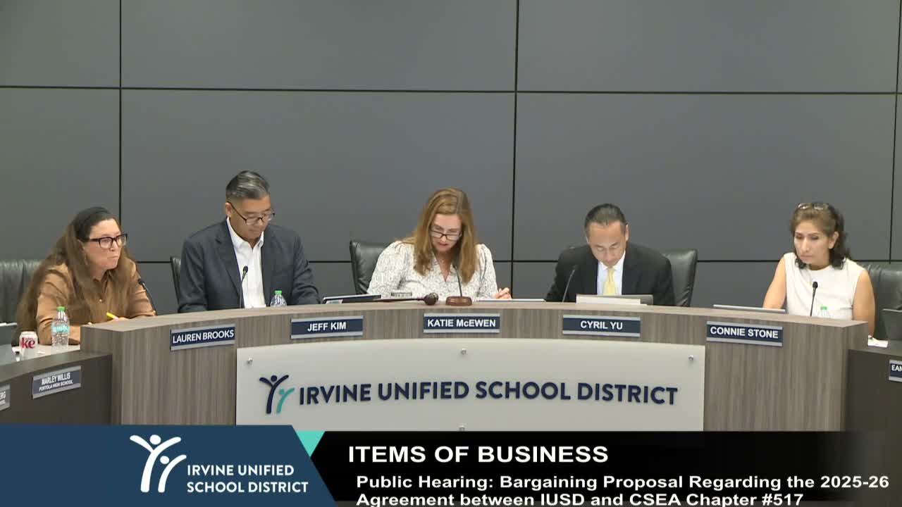 The Irvine Unified School District board approved certification that independent-study courses offered through San Joaquin and the IUSD Virtual Academy are equivalent in rigor and hours to corresponding in-person district courses for the 2025–26 school year.