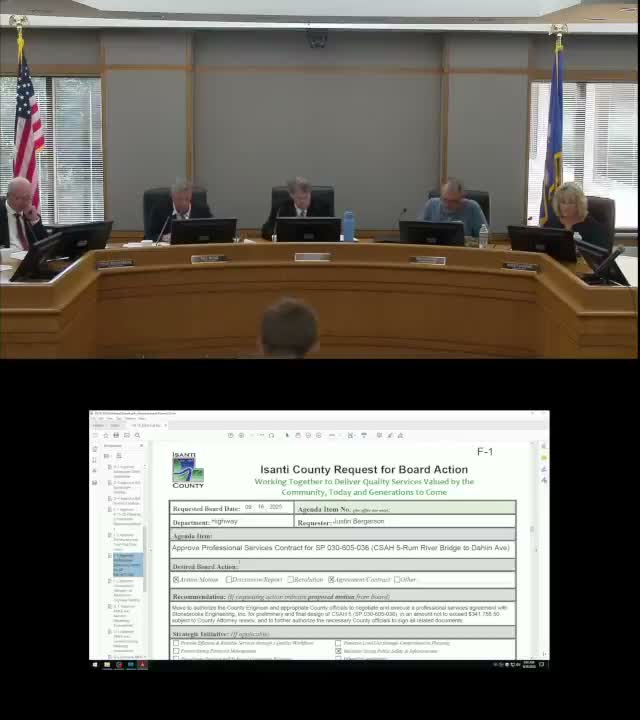 Board members asked about funding sources, cost-participation with the City of Isanti on CSAH 5 and the planned two-phase approach to construct a roundabout and then complete mill-and-overlay pavement work. Motions to authorize Stonebrook for the CSAH 5 professional services and to engage Kraus Anderson as construction-manager advisor carried on recorded motions.