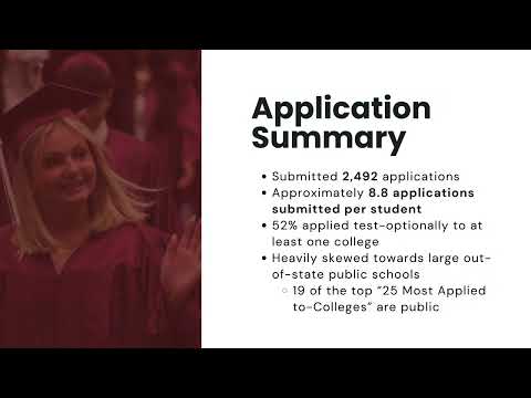 Data on application activity showed rising volume: counselor staff reported 2,492 total applications submitted by the class—about 200 more than the prior year—and noted that features of the Common Application and direct‑admit tools have contributed to higher application counts. Presenters added that about 52% of applications were to test‑optional programs and that some selective colleges are returning to score requirements, a shift counselors said families should monitor.