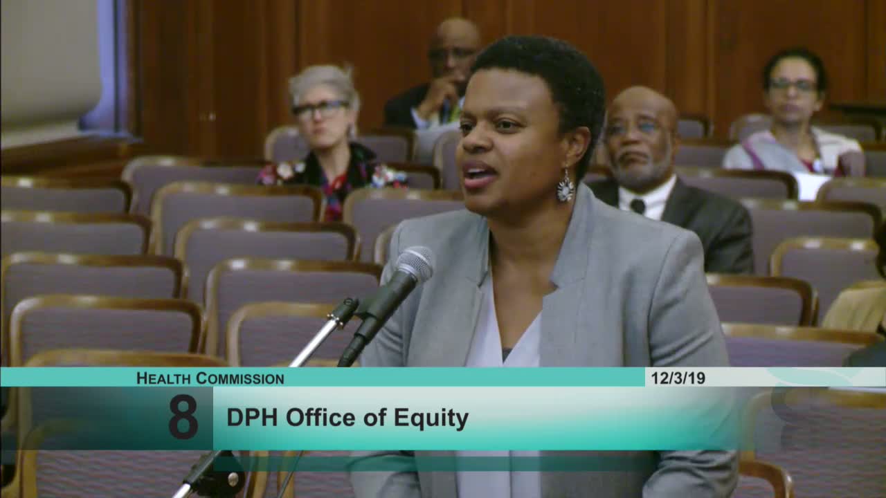 Dr. Ayanna Bennett outlined a new Office of Health Equity to coordinate racial‑equity work across DPH, add staff, establish governance, and scale programs that have narrowed disparities (including hypertension control for Black patients). Commissioners asked for measurable dashboards and written follow‑up.