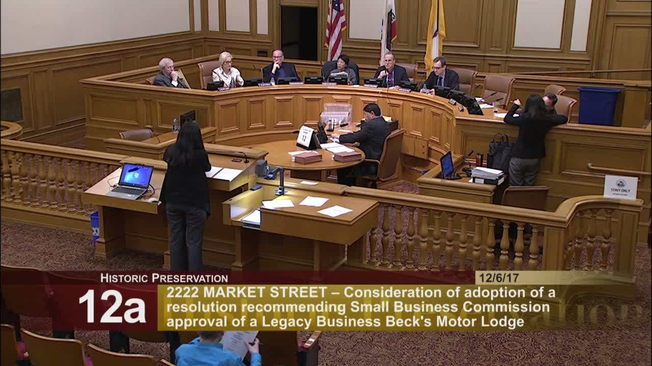 The Historic Preservation Commission unanimously recommended listing Beck's Motor Lodge, Eddie's Cafe, Little Joe's Pizzeria and 124 Hair on the Legacy Business Registry; staff corrected Little Joe’s founding year and said written support was added to the record.