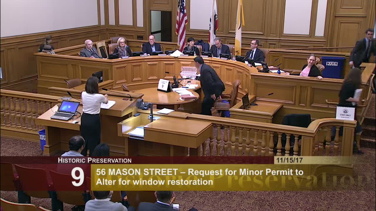 The Historic Preservation Commission approved a permit to alter for window restoration at 56 Mason Street — the Bristol Hotel — after more than an hour of public testimony alleging the building’s owner evicted low‑income tenants and is converting Single‑Room Occupancy (SRO) units toward tourist use.