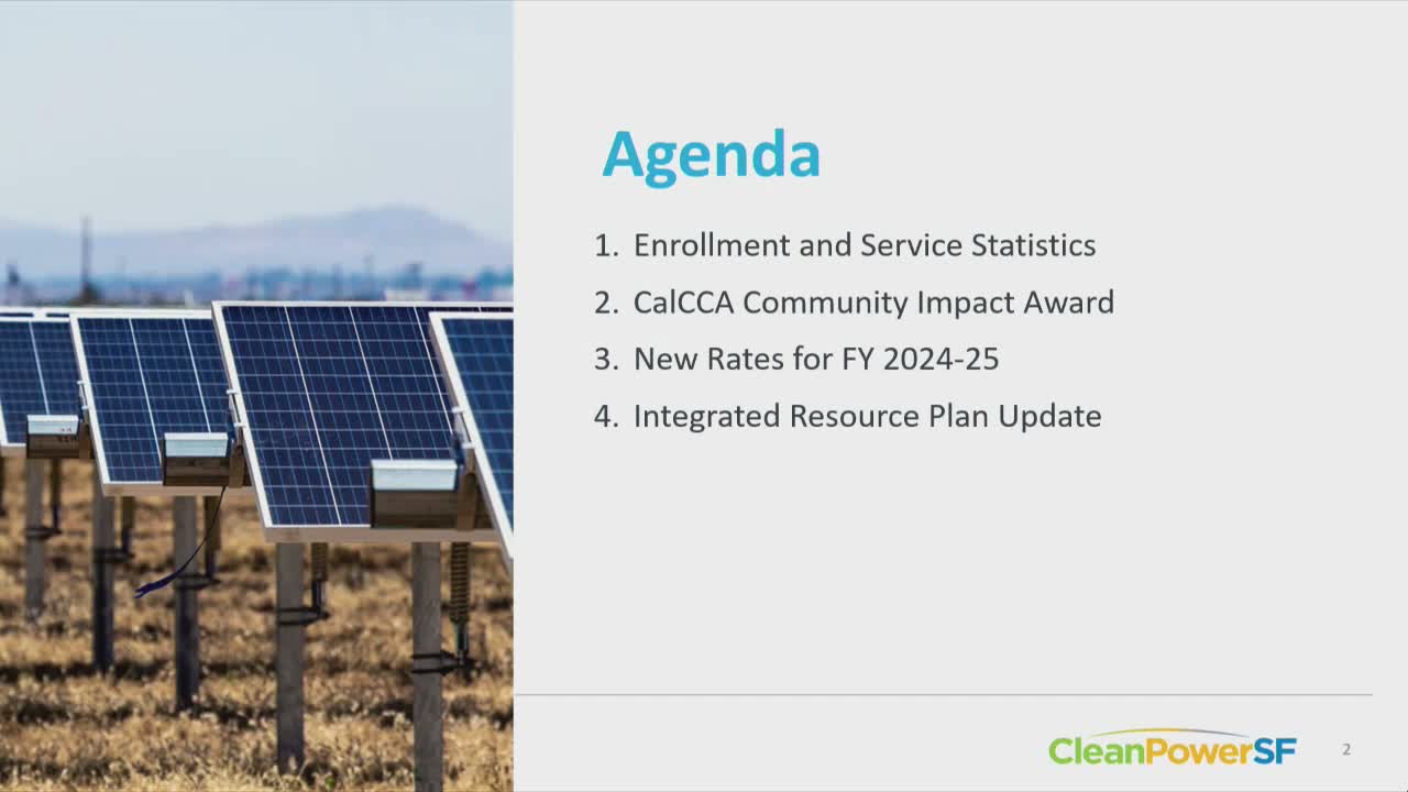 Clean Power SF staff told LAFCO the utility’s Super Green 100% renewable product now accounts for more than 15% of retail sales, announced new FY 2024–25 rates with an average generation charge increase from $35 to $39 to build reserves and avoid rate shocks, and outlined an integrated resource plan schedule required by the CPUC.