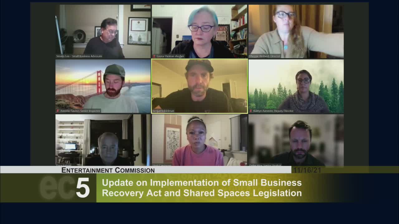 The Entertainment Commission heard detailed plans for implementing the state’s Small Business Recovery Act (SBRA) and the city’s shared‑spaces permanency, measures staff said will expand opportunities for venues while retaining neighborhood protections.