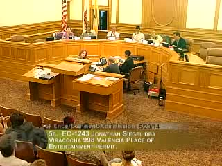 The San Francisco Entertainment Commission voted to conditionally grant a place-of-entertainment permit to Viracocha at 998 Valencia after hours of questioning and a large show of public support; the permit is contingent on building/fire/electrical approvals and selected police conditions, with certain police items covered by the Good Neighbor Policy.