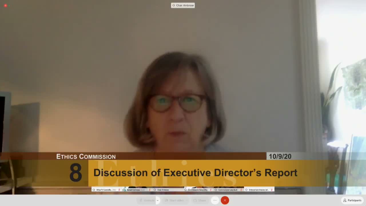 Executive Director Leanne Pelham presented administrative and program updates to the Ethics Commission on Oct. 9, including a mayoral directive on behested-payment disclosures, public-financing participation tallies, staffing and hiring plans, and the status of Form 700 filings.