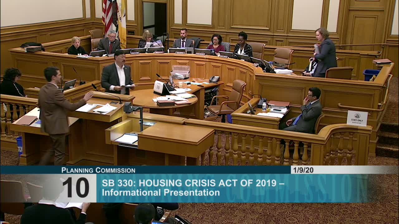Planning Department staff explained how the Housing Crisis Act of 2019 (SB 330) will change local process: a new preliminary housing development application can 'lock in' rules for a limited period, limits code‑complying projects to five public hearings, and imposes replacement housing and relocation obligations for demolished units.