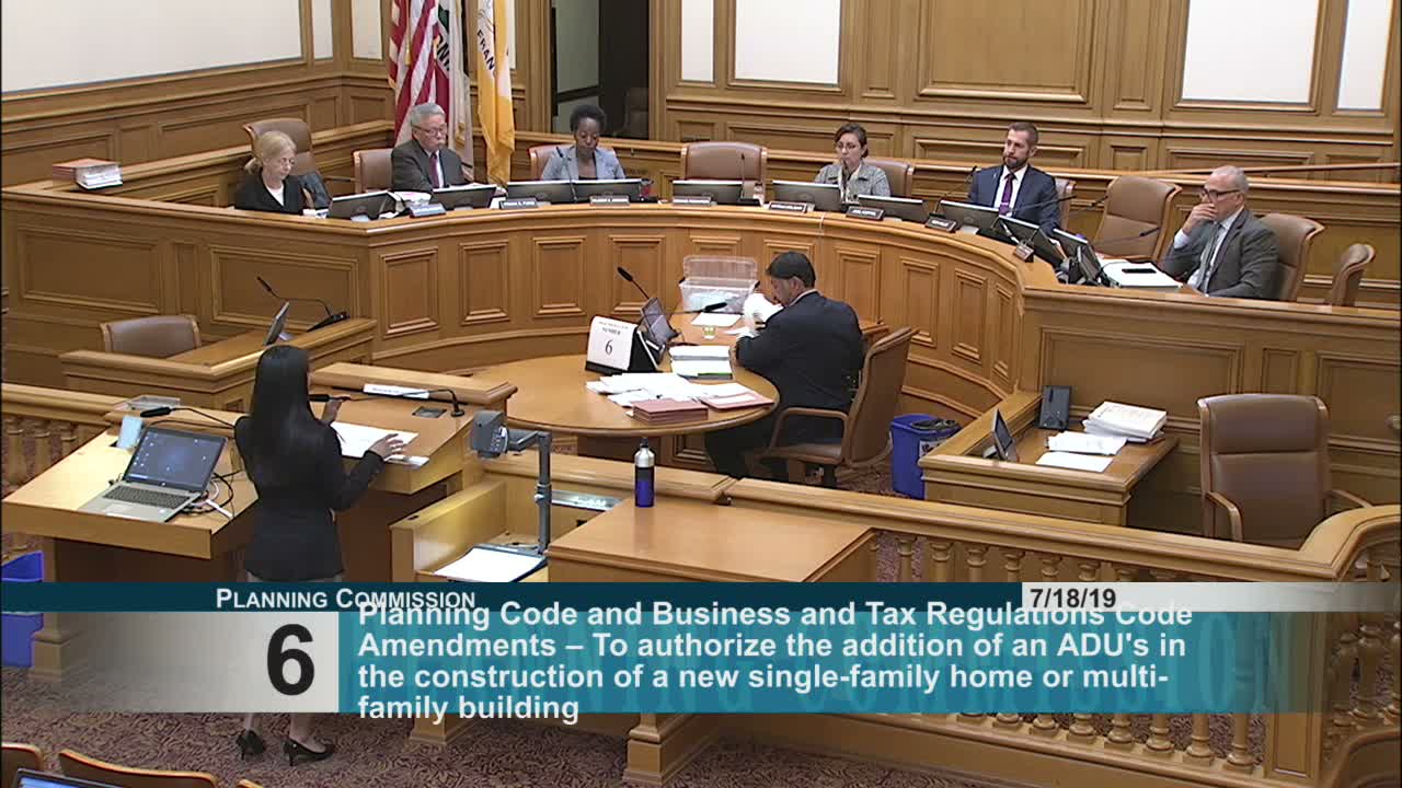The San Francisco Planning Commission on July 18 adopted amendments to local planning and business and tax regulations to allow accessory dwelling units (ADUs) in new construction and to bring local rules into compliance with recent state law. The measure, sponsored by Supervisor Aaron Peskin and presented by Veronica Flores of the planning department, passed unanimously 5–0.