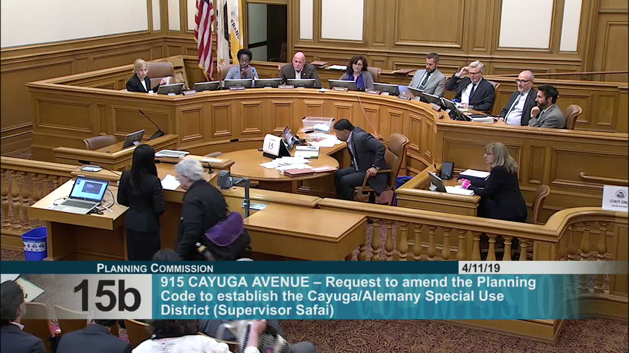 The Planning Commission unanimously approved a focused development agreement and zoning changes for 915 Cayuga, a 116-unit project that will provide 58 below-market-rate units (50% on-site) and a 70% family-sized unit mix; staff and the sponsor said the deal secures a performance schedule and neighborhood supports.