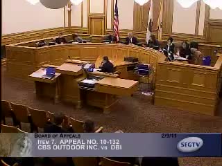 The Board considered appeal Ten-0132 brought by CBS Outdoor concerning a 14-by-23-foot general advertising wall sign at 1468 Folsom Street. CBS Outdoor's counsel, Anthony Leonis, said an operations mistake led to the company obtaining a removal permit rather than installing a required placard and asked the Board to invalidate the inspection or the permit so that the parties could restore the sign copy without new structural work.