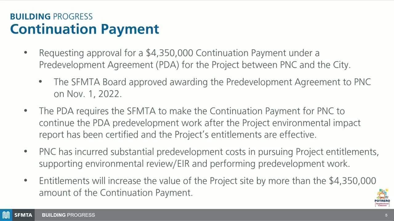 SFMTA asked the Budget and Finance Committee to authorize a $4,350,000 continuation payment to Potrero Neighborhood Collective (PNC) so the predevelopment agreement (PDA) can continue after entitlements and CEQA certification. The payment is specified in the PDA and would allow PNC to proceed with PDA Phase 3 work, including drafting term sheets and project agreements.