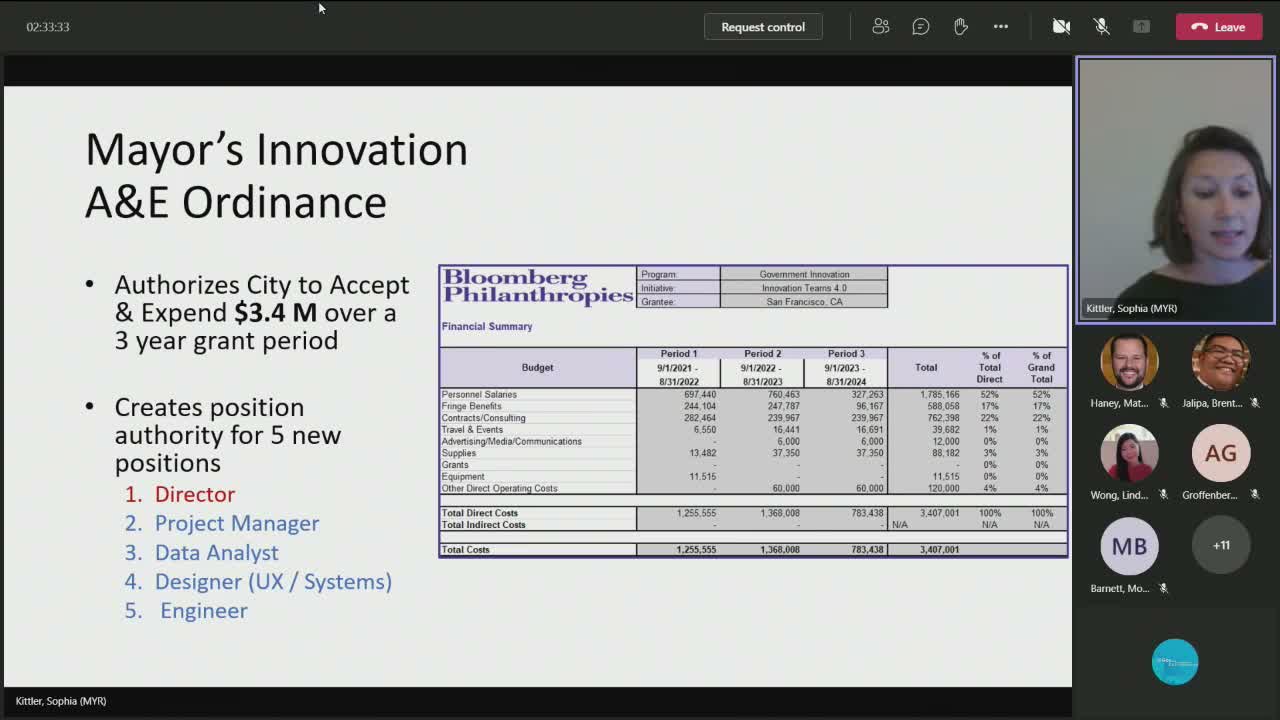 Sophia Kittler of the mayor’s office said the three‑year grant (Oct. 1, 2021–Aug. 31, 2024) funds an eight‑person innovation team—five positions paid by the grant and three existing civic‑innovation staff pulled into the office—to run short “strike team” projects that use data, human‑centered design and technology to address cross‑cutting city issues. Kittler said the effort is intended to coordinate existing capabilities (Digital Services, DataSF, Office of Civic Innovation and city performance) and elevate projects that require cross‑departmental policy attention.