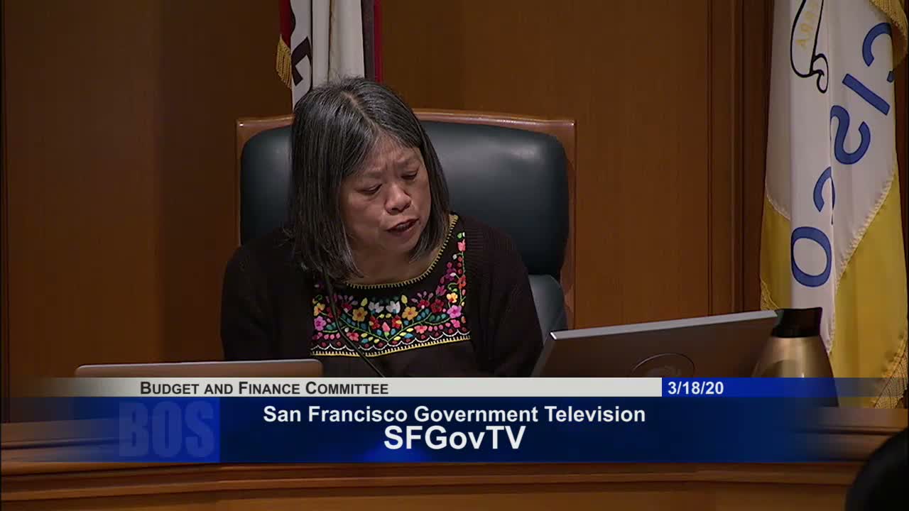 Chair Sandra Lee Feuer convened the San Francisco Budget and Finance Committee on March 18, 2020, and moved six agenda items forward for further Board or committee consideration. The measures included a tax‑exempt loan authorization for school financing, a long‑term shoreline ground lease, a Public Utilities Commission consulting contract, two state grant acceptances, and proposed amendments to a multifamily housing revenue bond agreement.