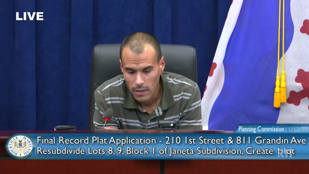 The Rockville City Planning Commission unanimously approved two final record plats and one ownership plat on Nov. 12, 2025, clearing the way for lot consolidations, a right-of-way dedication and separate financing for Georgetown Health School and Woodley Gardens Pool.