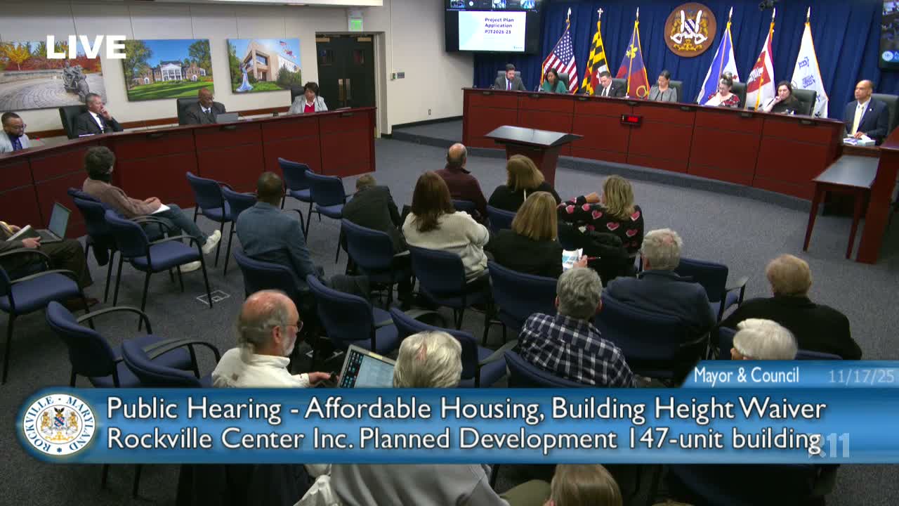 The Rockville Mayor and Council on Nov. 17 voted unanimously to approve Project Plan PJT 202523, allowing SCG Development and co‑applicants to build a 12‑story, 147‑unit affordable housing building at 41 Maryland Avenue in Rockville Town Center.