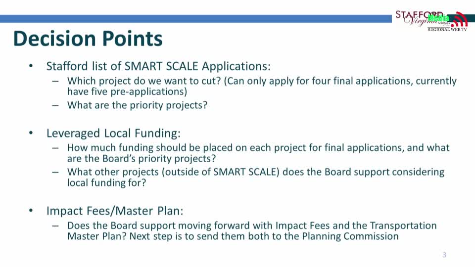 Staff presented options for implementing the Transportation Master Plan and asked the Board to choose which four of Stafford County’s five Smart Scale pre‑applications should move forward to final application.