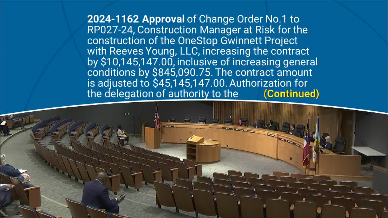 The Gwinnett County Board of Commissioners on Dec. 10 approved Change Order No. 1 to contract RP2724 with Reeves Young LLC, increasing the construction contract for the 1 Stop Gwinnett facility by $10,145,147 to a revised total of $45,145,147.