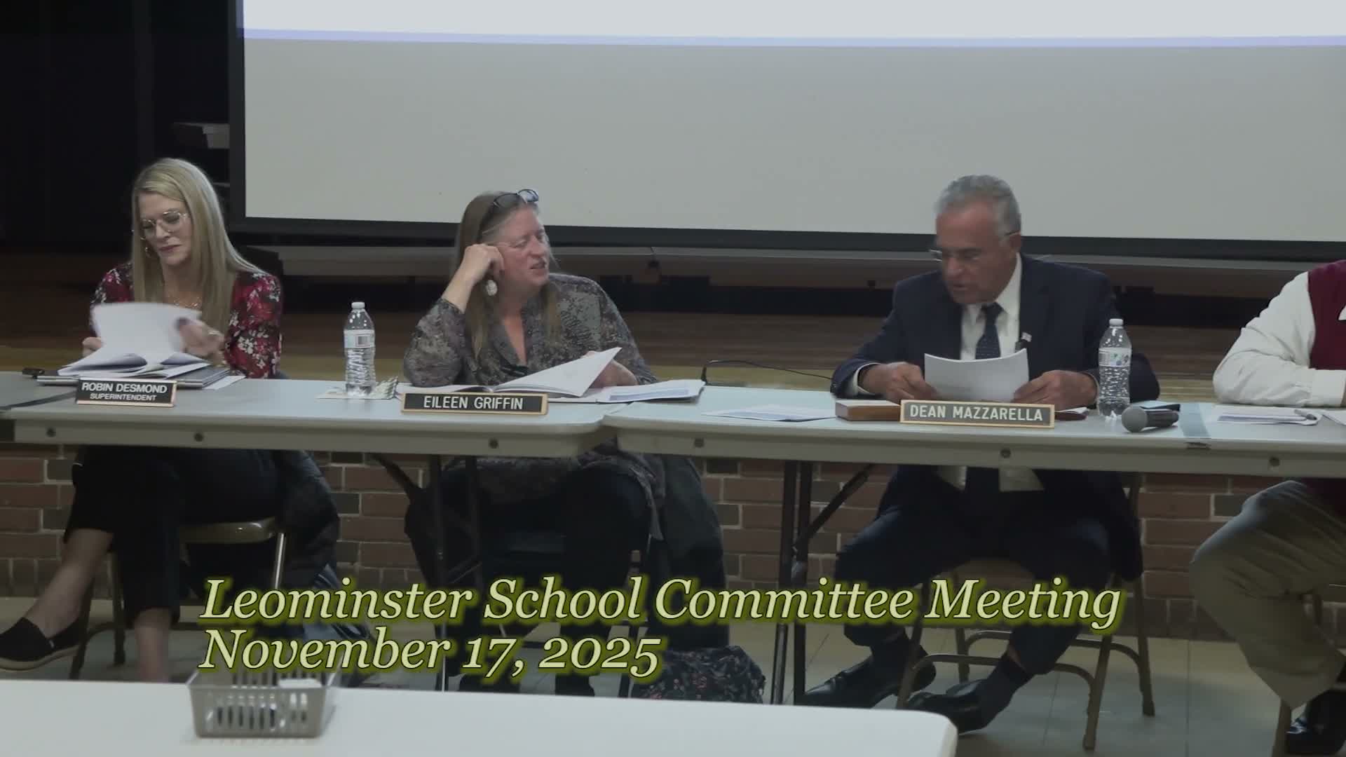 Leominster School Committee approved minutes, accepted a $2,274.58 donation from contractor Matt Kidd and approved a SkillsUSA participation item; the committee also heard a recommendation to solicit bids for a Francis Drake playground project estimated not to exceed $250,000 and asked staff to return with detailed estimates and DPW input.