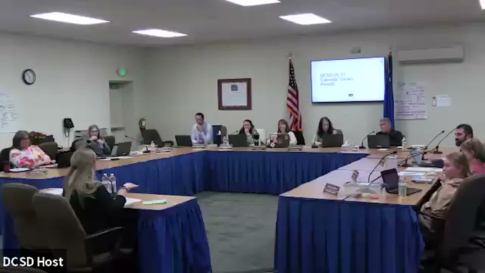 The board reviewed a community survey (659 family, 307 staff responses) on school calendar options and directed staff to produce multiple drafts — including one that starts as late as possible but removes October and February breaks to finish before winter break — for consideration next month.