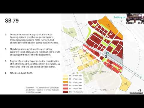 City staff summarized SB 79 as intended "to increase the supply of affordable housing, specifically around train stations," and said the law requires mandatory upzoning near rail stations and rapid bus corridors with different requirements tied to distance from stations. Staff noted SB 79 does not change CEQA procedures, but that projects qualifying under SB 35 or SB 423 could use exemptions those laws provide. Staff also said the state Housing and Community Development (HCD) department will develop maps and guidance, and cities may propose an alternate TOD plan that HCD will review (staff said the HCD review period in the bill is 120 days). SB 79’s effective date was stated as July 1, 2026.