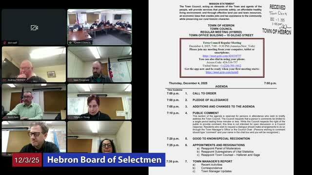 The Hebron Town Council on Thursday completed a number of formal actions across appointments, procurement and grant endorsements.