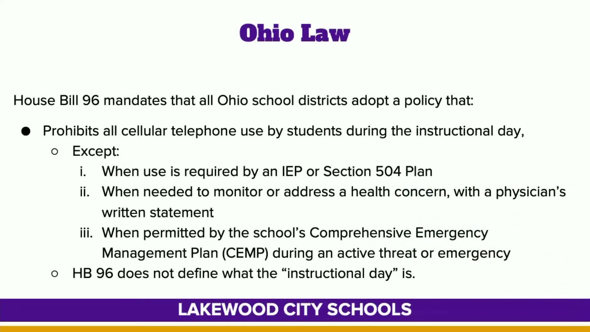 District staff summarized exceptions the law allows, saying the ban would not apply when phone use is required by an IEP or 504 plan, when phones are needed to monitor or address a health concern, or when allowed by a school’s emergency operations plan. "House bill 96 mandates all districts must adopt a policy by January 1 that outlaws, cell phones during the instructional day with the exception of when use is required, by an IEP or 504, when needed to monitor or address a health concern, when permitted by the school's comprehensive emergency management plan," the staff presenter stated.