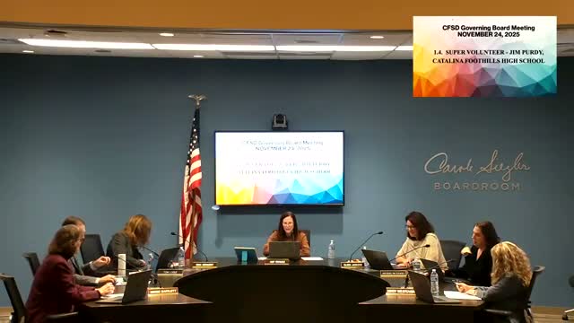 The Catalina Foothills Unified School District governing board recognized Jim Purdy for extensive volunteer service to athletics, citing roles as basketball booster president, AIA-certified referee and frequent support at events.