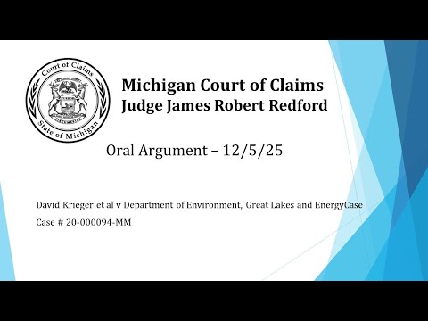 Judge John Redford convened a Dec. 5, 2025 hearing on five pretrial motions in David Krieger et al v. Michigan Department of Environment, Great Lakes and Energy et al., Court of Claims case number 20-94MM. The judge opened the record by noting the date and the caption and then invited appearances from plaintiff and defense counsel.