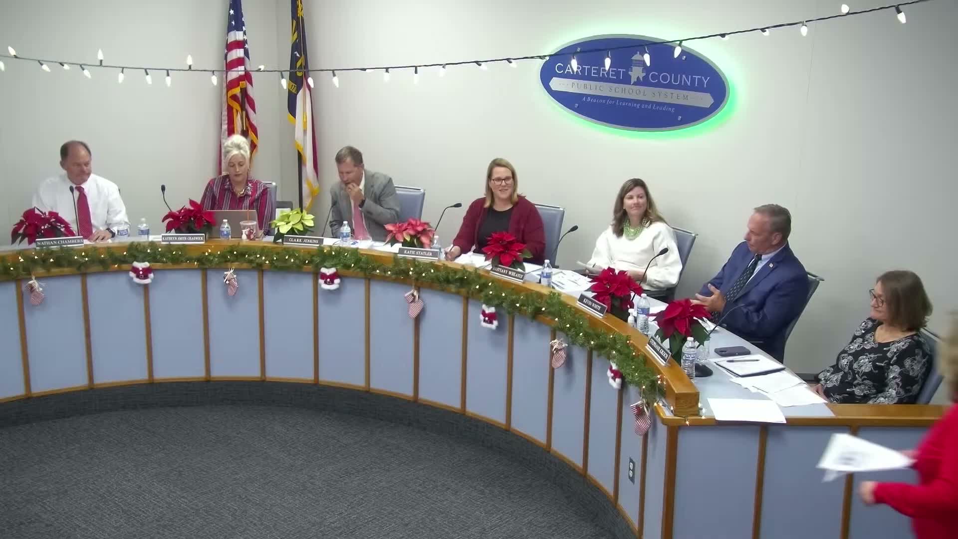 Calendar committee member Mike McKay outlined the local process for developing the draft 2026–27 calendar, including principal and parent advisory input and coordination with Carteret Community College to support dual enrollment. McKay referenced statutory requirements for start and end dates and minimum instructional days and hours (the transcript references the statute commonly cited as N.C. Gen. Stat. § 115C-84.2) and said the proposed calendar balances semesters at 85 student days each, sets student days at 170 and staff days at 215. Board members asked clarifying questions and one member said he would not support the calendar on principle because of statewide policy choices; McKay emphasized the calendar is not final and a vote will occur next month.