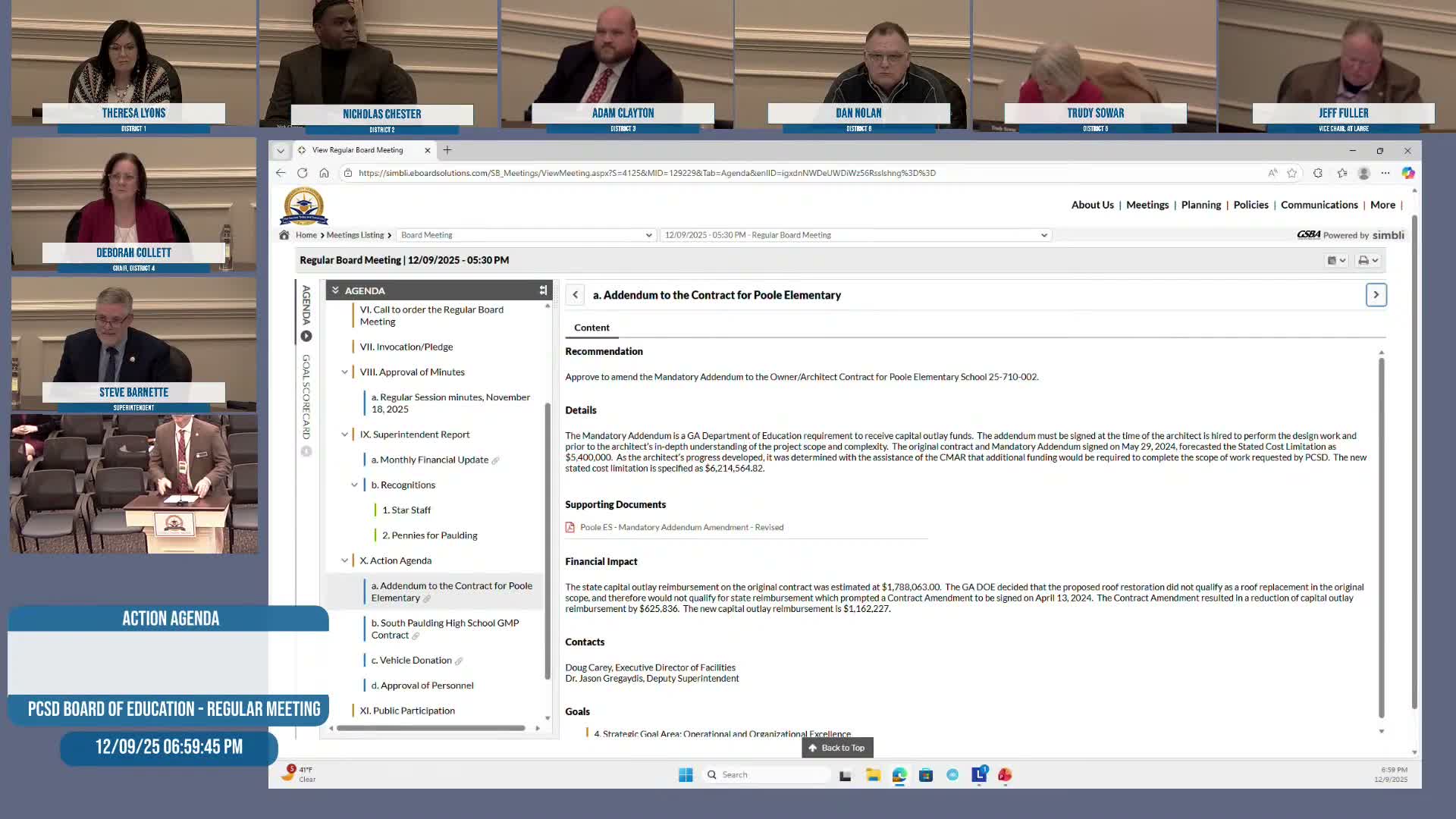 Doug Carey, the district’s executive director of facilities, presented a mandatory Georgia Department of Education addendum for Poole Elementary and said the architect’s updated cost estimate is $6,214,564.82, up from an original forecasted cost limitation of $5,400,000. Carey explained the district elected to restore rather than fully replace the school roof (restoration estimated at $200,000 vs. replacement at $1,200,000) and summarized the reimbursement adjustments, saying, "We saved $374,000." The board approved the amendment to the owner–architect contract (25-710-002) as presented.