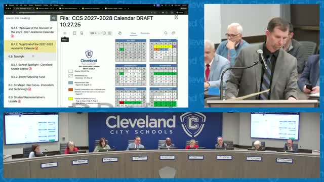 Cleveland Middle School highlighted student projects, CTE connections and extracurricular successes; volunteers and staff recognized Brenda Lawson and described the Empty Stocking Fund serving roughly 1,400–1,500 children this season and a radio fundraising drive through Dec. 12.