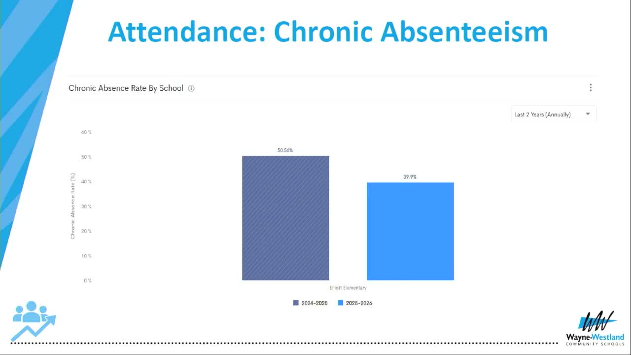 Elliott Elementary staff presented data to the Wayne‑Westland Board showing gains in attendance and academic measures and outlined social‑emotional and community supports.