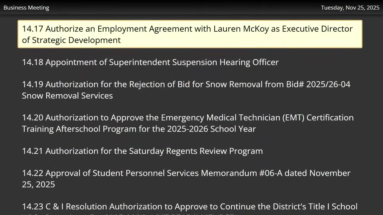 The board approved an employment agreement for an executive director of strategic development (Lauren McCoy) — a Title-funded grant-management position — after trustees voiced concern about short notice, process and salary level; the motion carried with recorded abstentions.