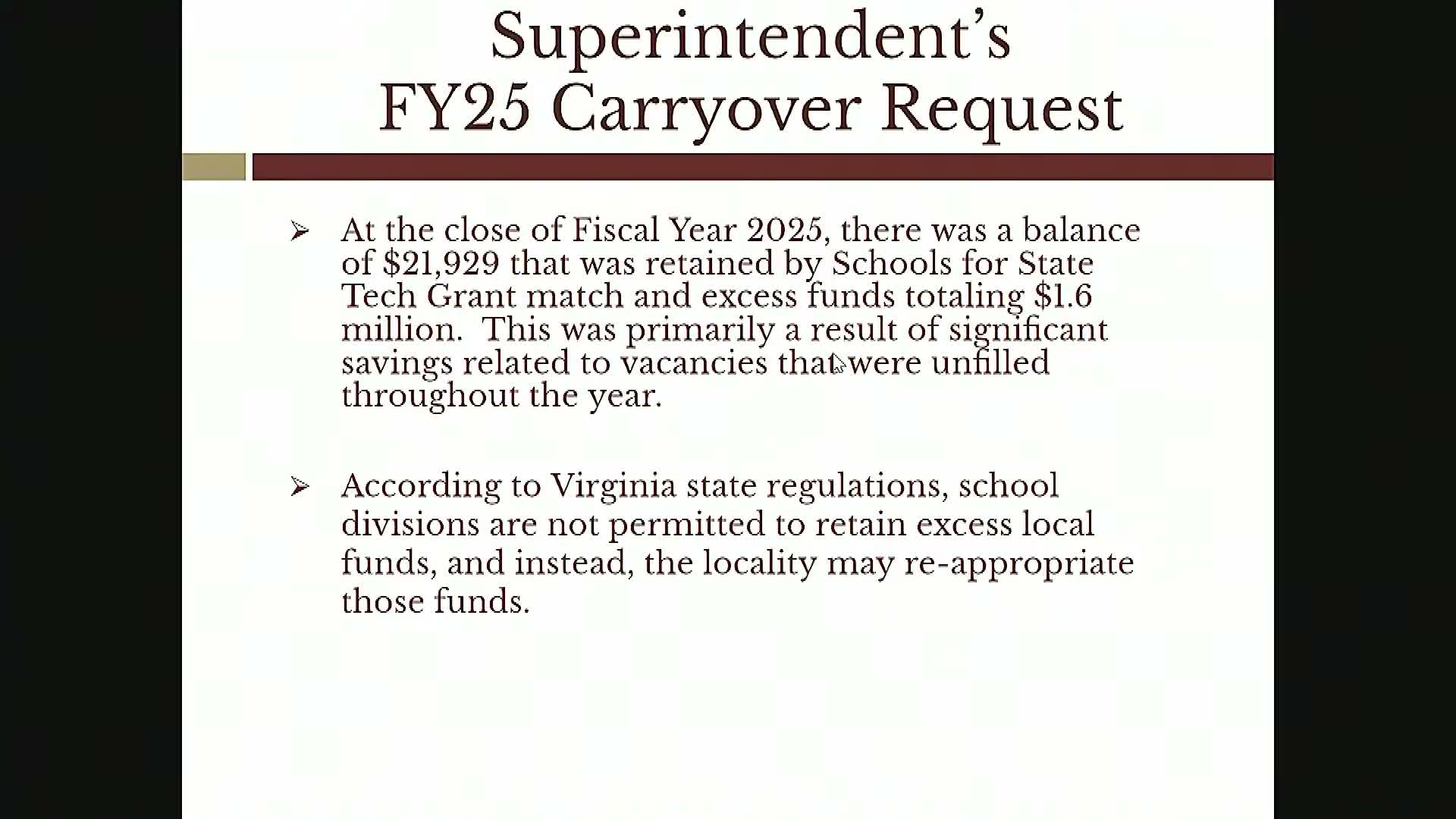 Miss Spence, who presented the finance report, said the FY25 audit produced an "unmodified" opinion with no significant findings. She reported the division ended FY25 holding $21,929 reserved for a state technology match and $1,600,000 in excess funds that, under Virginia regulations, the locality must reappropriate rather than the school division retain.