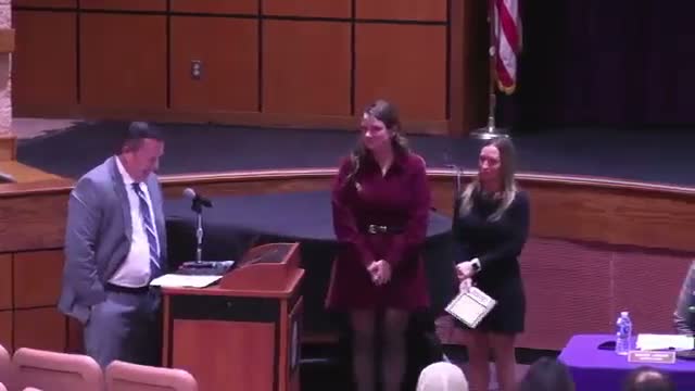 Athletics also received applause: Mr. Foster asked the girls varsity volleyball team to come forward and congratulated the squad for a 14–5 overall season and a playoff berth, and he listed several players who earned league honors. Foster also noted the district awarded "scholar-athlete" team recognition to multiple teams that met the district’s academic threshold.