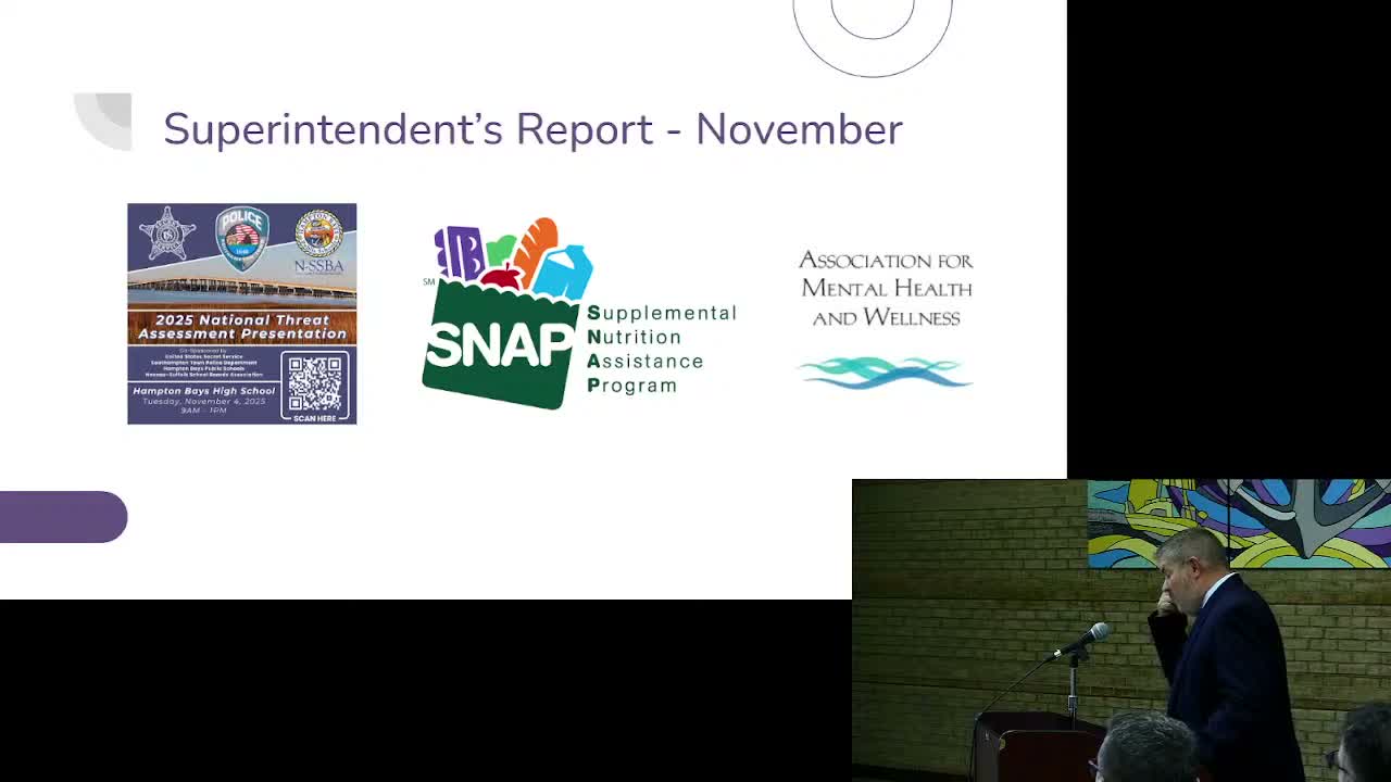Federal funding context: Superintendent and staff outlined that a federal SNAP benefits suspension (which temporarily affected some families) ended Oct. 31, and they noted draft federal budget proposals could cut Title I–IV grants (the superintendent estimated about a $140,000 reduction in Title grants for Hampton Bays if proposed cuts stand). Staff said the continuing resolution currently funds programs only through January, creating near‑term uncertainty for planning.