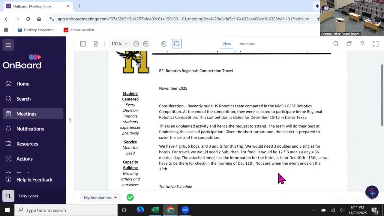 A district presenter said the team earned qualification through a live robot competition and an engineering notebook submission. Staff estimated total travel, lodging and meal costs would be "no more than $7,500." The board moved, seconded and approved the request by voice vote; no roll‑call tally was recorded in the transcript.