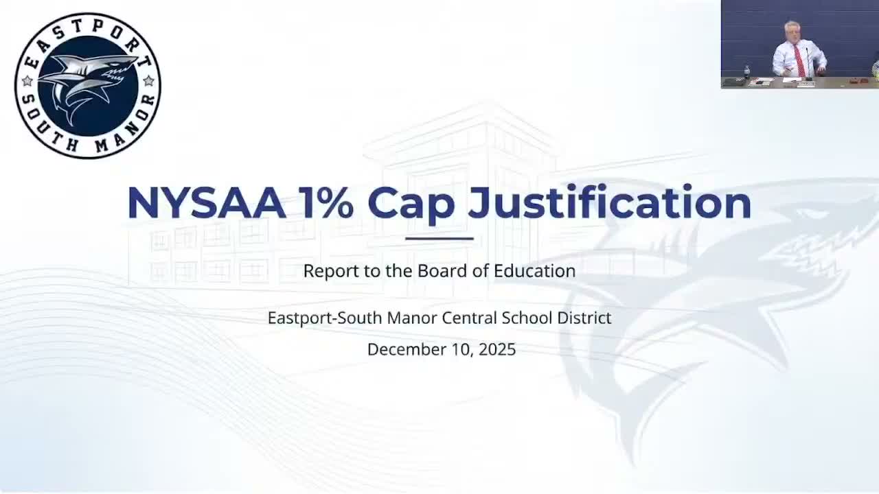 Eastport-South Manor staff told the board the district exceeded the federal 1% cap for alternate (NICE) assessments (ELA and math 1.66%; science 2.57%); the state requires a corrective-action process and a state-led intervention starting immediately with an eight-person committee.