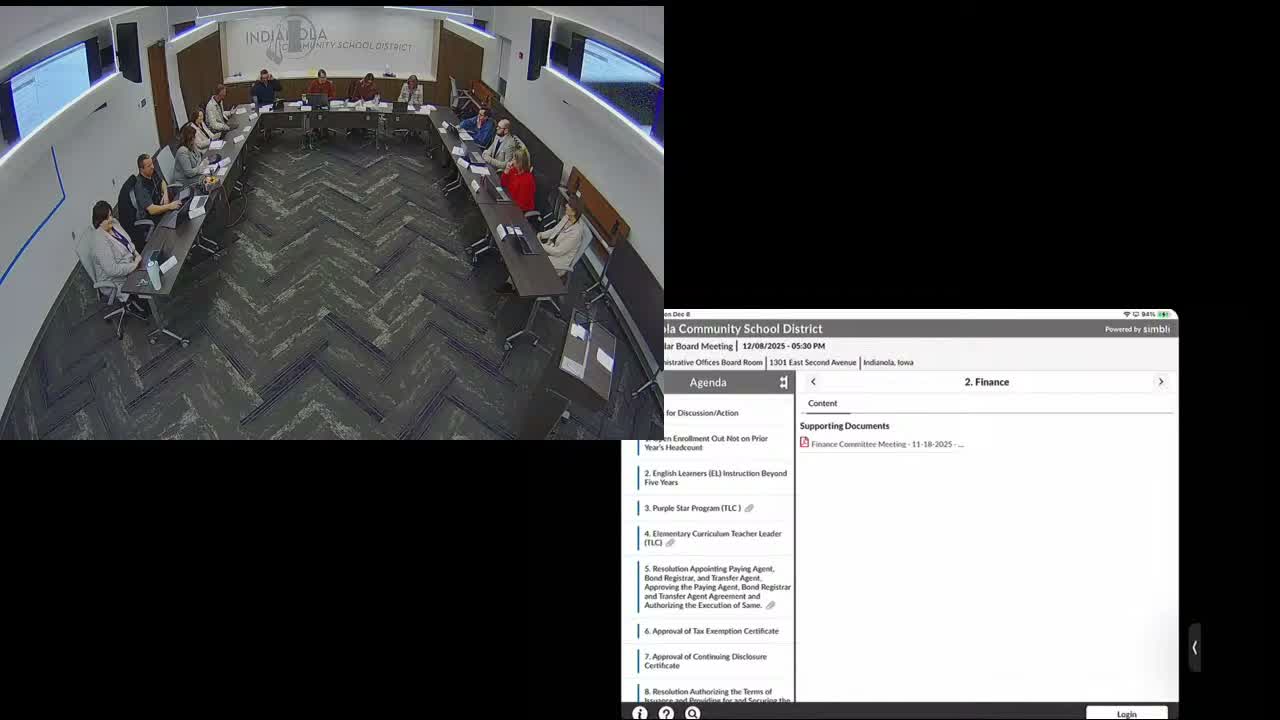 The Indianola Community School District board unanimously approved a $29,000,995 bond issuance and a package of budget and staffing motions, including modified supplemental authority requests for open-enrollment and long-term English-learner students; all votes were unanimous.