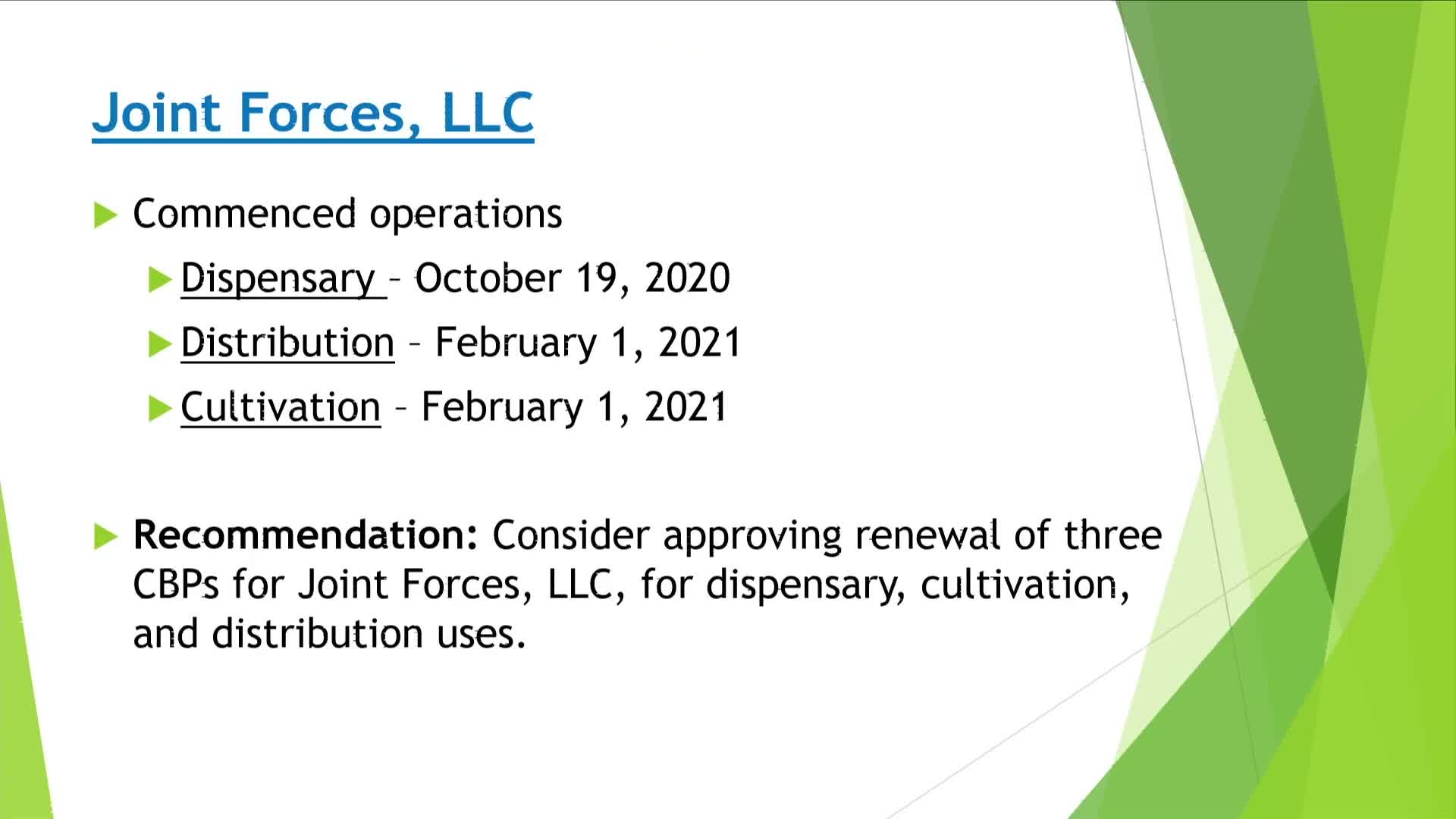 Joint Forces LLC also received unanimous approval to renew its three permits (dispensary, distribution and cultivation). Applicant representatives described security staffing (a 24-hour physical guard), extensive camera coverage and procedures that can occasionally produce false alarms.