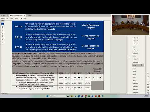 Several commissioners raised practical concerns for implementation, including special-education staffing and retention, the effect of districtwide rollout of standards-based grading, and whether combined indicators (fine arts, world languages and CTE) obscure declines in specific areas. Staff acknowledged those issues and suggested report refinements and additional disaggregations are possible in future monitoring cycles.