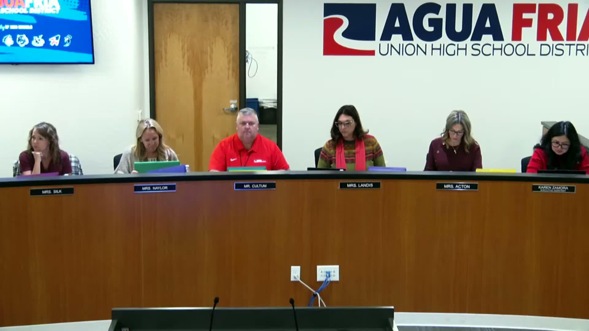The Agua Fria Union High School District governing board voted Dec. 10, 2025, to adopt the presented school calendars for the 2026–27 and 2027–28 school years after a staff presentation and trustee questions about instructional days and scheduling.