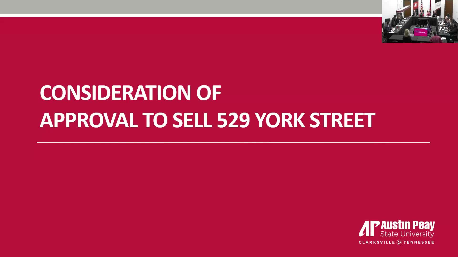 The Austin Peay State University Business & Finance Committee voted to authorize the sale of 529 York Street, directing university leadership to accept the highest offer through the state's required real‑estate process.
