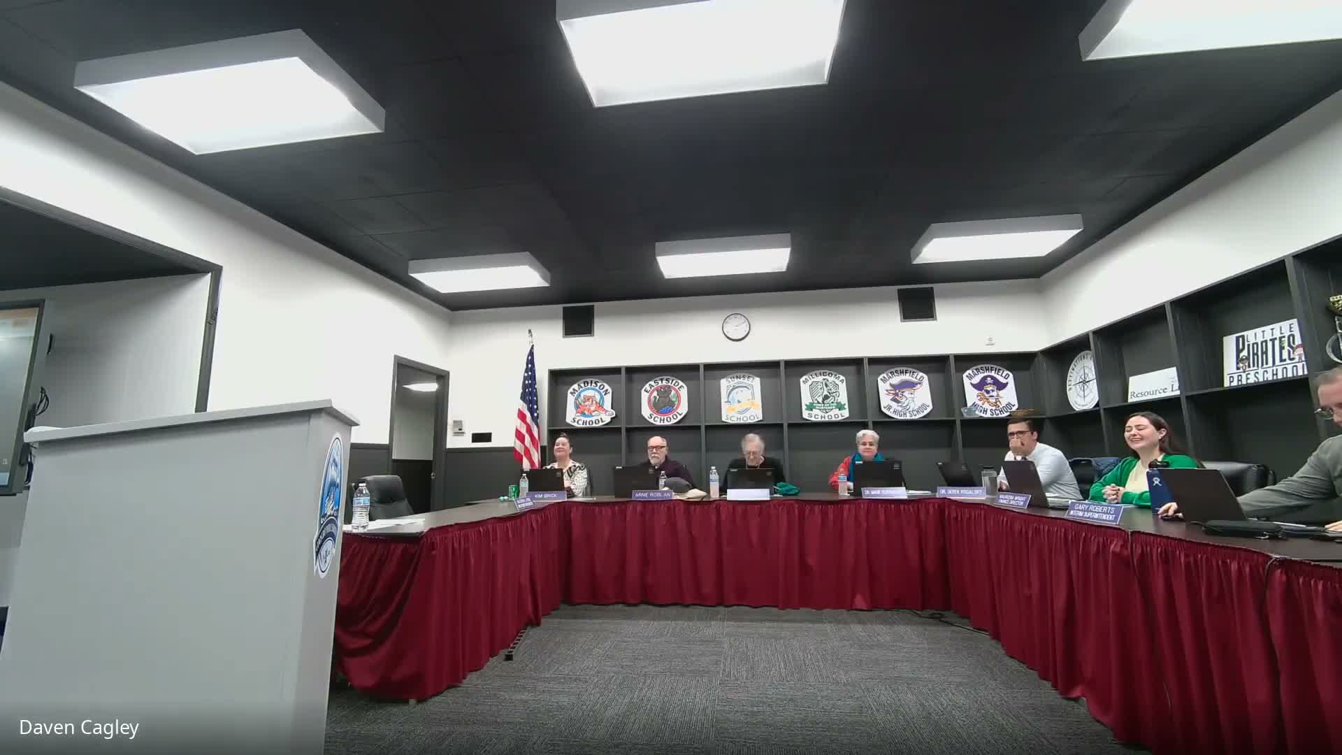 Marshfield band director John Cruz received board permission to send three students to the Western International Band Clinic in Seattle and to begin fundraising/planning for a potential Pearl Harbor Day Parade trip for the full high‑school marching band, estimated at 40–60 students.