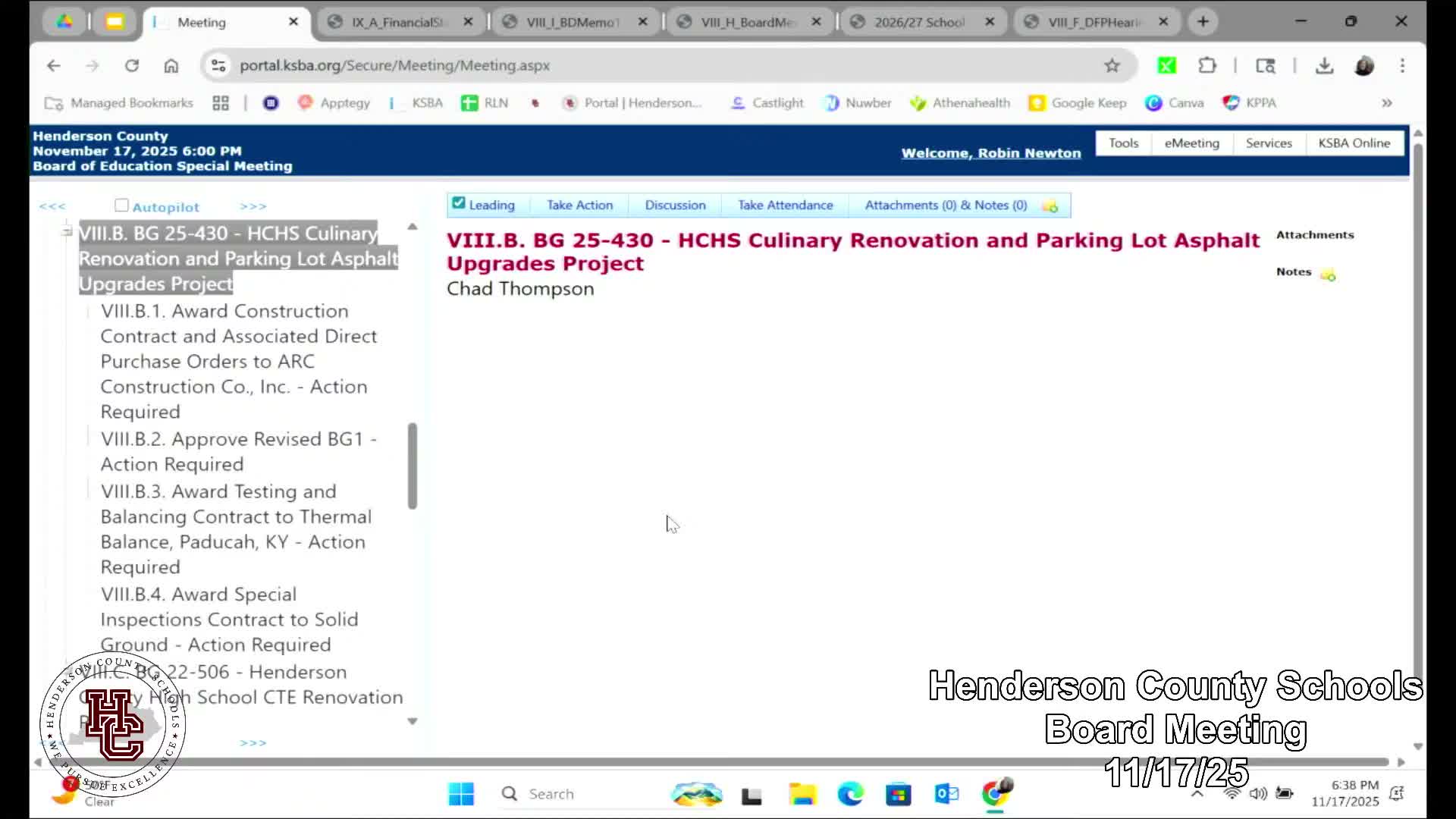 The Henderson County Board approved construction contract awards (ARC Construction) for a culinary renovation and parking lot upgrades at Henderson County High School, special inspection contracts to Solid Ground, multiple change orders for the CTE renovation (BG22-506) and wastewater systems, and approved the district facility plan hearing report to be sent to KDE.