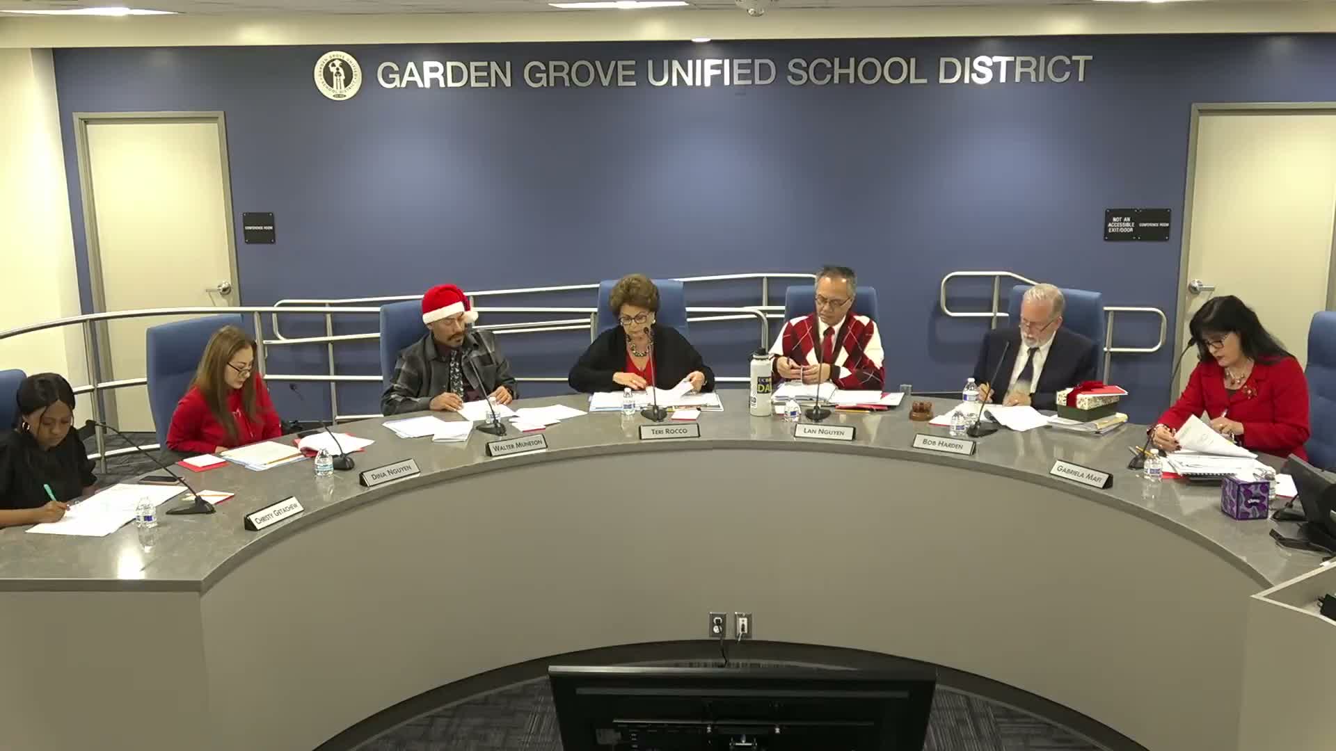 The Garden Grove Unified School District board approved its consent and business calendar (items 6A–6L), encompassing financial certifications, contract awards, purchasing agreements and other routine business.